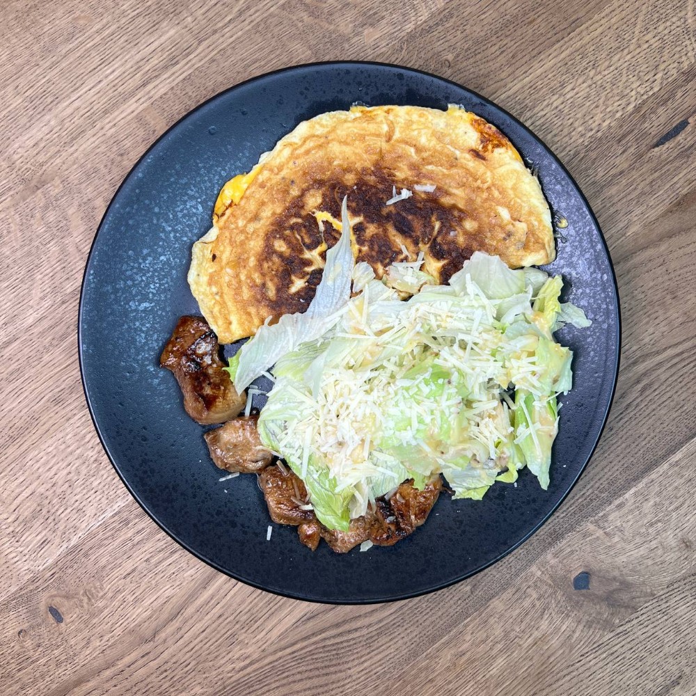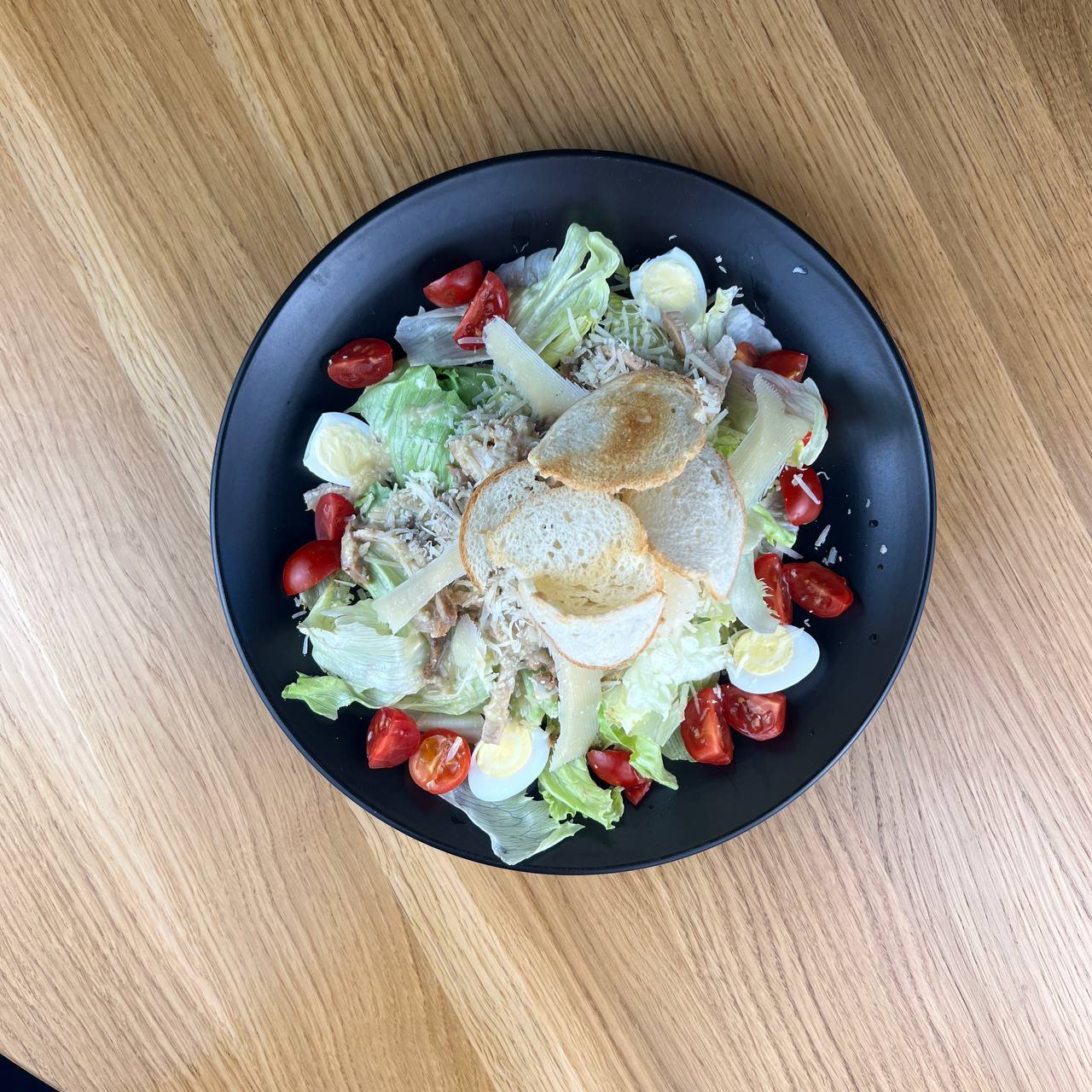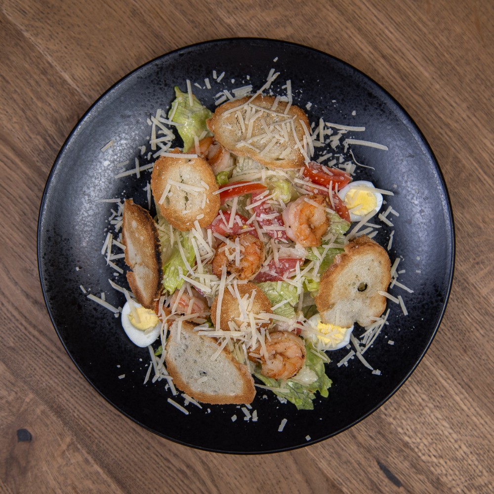 Салат айсберг, томати, креветка тигрова, яйце перепелине, соус цезар, пармезан та грильовані хлібці.Вага: 260гр